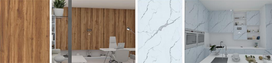 性能特點:無毒、無放射性、B 級防火、不沾油、不滲汙、抗黴防菌、耐磨耐衝擊、易保養、拚接無縫、任意造型。