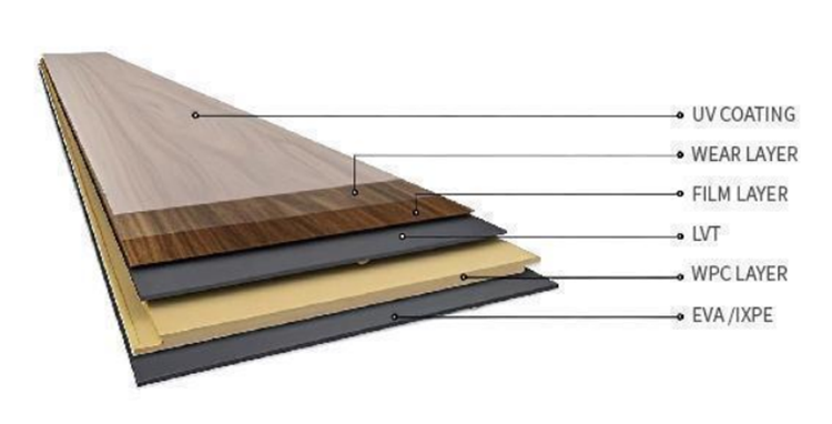 WPC地板即木塑複合地板,由多種材料複合而成。表麵的UV塗層增強耐(nài)磨性和抗汙性;耐磨層進一步保護地板;膜層賦予其逼真的外觀;LVT層提供一定彈性和(hé)穩定性:WPC層是主要結構層,結合了木材和塑料特性;底部的EVA或IXPE層起(qǐ)緩(huǎn)衝和隔音作用。它環保、防水、耐用,適用於多種場所。
